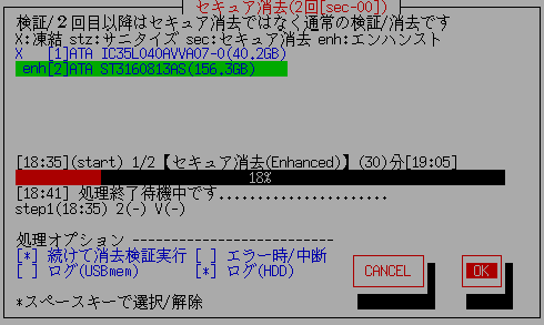 下記の例では、ディス全体の容量は(156.3GB)ですが、HPA/DCOが設定されているため、通常のアクセスは(100.0GB)に制限されていることを表します。 ※システムでHPA/DCO情報が取得できない場合もあります。ディスク本体の容量は、別途ご確認の上処理してください。 ![]() この場合、セキュア消去は(156.3GB)全体を消去するのに対し、2回目以降の消去、読み込み検証は、(100.0GB)の範囲に対して行われます。 ATA ST160813AS(100.0GB/156.3GB<!DCOleft>) のように表示されることがあります。 これは、DCO設定がされていて、かつ、エンハンストセキュア消去に対応していない場合の表示です。 DCO設定で制限されているエリア外の部分は消去されないことを示すメッセージです。 一覧で 「↑」「↓」キーを使いディスクを選択し、[tab]キーでオプションの設定に進みます。 ※同じディスクに対し、別画面で複数の処理を行うことはできません。 処理オプションの設定 「消去方式指定」、「パスワード指定自動実行」、「フルオート実行」時には、以下は、あらかじめ設定されたものが表示され、変更できません。「起動環境作成時の共通オプション」「消去方式の指定」参照。 ※ [ ] のように、カーソルがある状態で、[space]キーを押すことにより、選択/解除を変更します。 [ ] 続けて消去検証実行 消去処理が終わったあと、ディスク内の読み取り作業を行い、すべての部分が消去されているかの検証処理を行います。 検証処理は、セキュア消去/サニタイズとは異なり、通常の読み込み検証処理です。 「セキュア消去/サニタイズ1回」の処理の場合、検証はゼロの確認ではなく、全セクタが、第一セクタの内容と同一かどうかの検証を行います。これは、セキュア消去の書き込みが必ずしもゼロではなく、メーカーが定める特定の値の書き込みの場合があり、そのことに対応するためのものです。 ただし、HDD/SSDによっては、ランダムな値が書き込まれることがあり、その場合、検証のステップでは消去の確認を行うことができません。(検証エラーとしてカウントアップされます) その場合はセキュア消去の後に「00」書き込みを行う2回[sec-00]を選択した上で、続けて消去検証実行を行う必要があります。 [*]の状態が「検証を行う」という選択です。 [ ] エラー時/中断 途中でディスクへの書き込みエラーが発生した場合、処理を中断するか、無視して継続するかの選択です。 無視して継続する場合、エラー件数(error)のみカウントされます。 セキュア消去処理ではエラーはカウントされません。2回目以降の書き込み処理/検証処理においてのみ発生する可能性があります。 [*]の状態が「中断する」という選択です。 [ ] ログ(USBmem,FD) [ ] ログ(HDD) ログについては、、「ディスクの完全消去」をご覧ください。 消去の実行 処理が可能な場合、[tab]キーでカーソルを送り、「OK」で[enter]を押すと、消去が開始されます。 「Cancel]で画面を終了します。 ※画面表示は、処理により若干異なります。 ATA(SATA)ディスクのセキュア消去での画面 ![]() 現在の処理状況、各ステップごとの開始時刻が表示されます。 [hh:nn](start) ・・・ 現在のステップの開始時刻、処理内容。終了予定時刻。 ------------18%------------------------ ・・・ 現在のステップの進行割合 [hh:mm] ・・・ 現在時刻 step1(hh:nn) 2(-) V(-) ・・・各ステップごとの開始時刻(Vは検証ステップ) ※ATA(SATA)ディスクのセキュア消去での進行割合は、「処理時間」に対する経過時間を示しています。 ディスクの処理の実際の進行割合ではありません。 ATA(SATA)ディスクのサニタイズ処理での画面 ![]() ※ATA(SATA)ディスクのサニタイズでの進行割合は、ATAの規格上は 1/65536 -> 65536/65536 までで終了となります。 ただし、ディスクのメーカー/型番によっては、 1/65536 -> 100/65536 までで終了となるものがあります。その場合、割合としては0%のままとなります。(正常処理) eMMCサニタイズ処理での画面 ![]() 処理時間について セキュア消去-ATA(SATA) セキュア消去の処理時間は、あらかじめメーカーが定めたものを、事前に知ることができます。この値はどのようなPCに接続して処理してももほぼ一定です。画面に「終了予定時刻」が表示可能なのはそのためです。 処理時間は、「ディスクの状況表示」でも知ることができます。 ただし、ディスクによっては、その値が得られず、「ディスクの状況表示」において(0)となっている場合があります。 その場合は、仮に120分として処理を行っています。そのため、表示されている時間と大きく異なる場合があります。 また、この値はあくまで目安としての値で、実際の消去時間は前後します。 (若干速く終了することが多いようです) サニタイズ処理-ATA(SATA) サニタイズ処理の処理時間は、事前に知ることはできません。画面の進行状況により把握してください。 セキュア消去/サニタイズ処理-NVMe セキュア消去/サニタイズ処理の処理時間は、事前に知ることはできません。画面の進行状況により把握してくだ