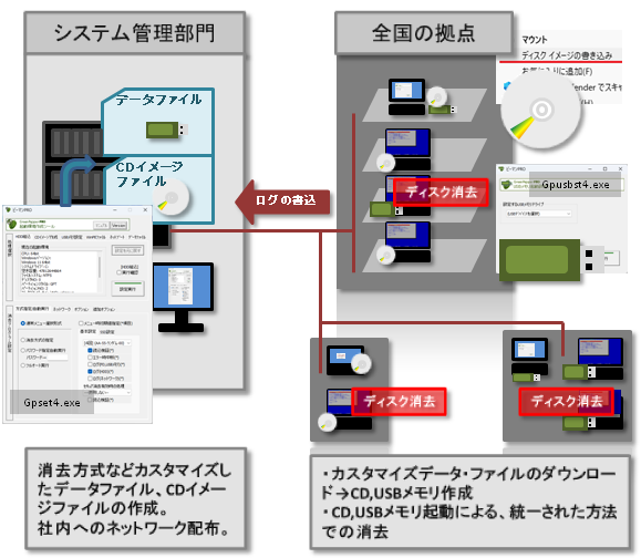 左図のような運用方法が可能です。 システム管理部門が、セキィリティポリシーに従って作成した、配布用の消去プログラムセットを作成し、社内共有サーバーに保管。社内他部署では、社内ネットワークを通じ、消去プログラムセットを取得し、PCの消去を行う。消去ログは、ネットワーク上の共有サーバーに保管され、システム管理部門が一括管理する。