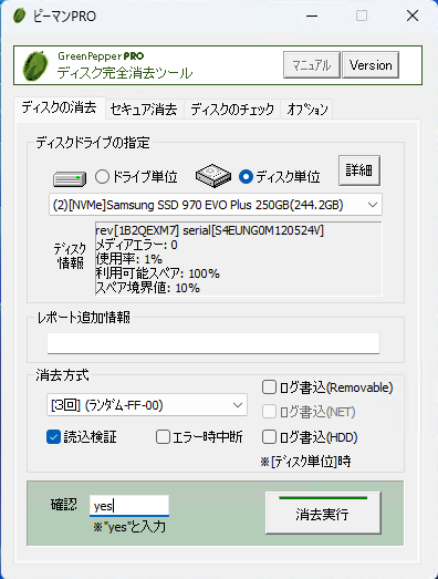 もう一つの方法は、Windows/WinPEで動作する消去プログラムを使用することです。 WinPE起動で使用した場合、システムドライブを含む全ドライブが消去可能で、セキュア消去(Secure Erase)/サニタイズ消去(Sanitize)も対応します。 ※通常のWindows起動状態では、システムドライブは消去できません。