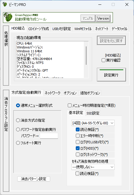 この画面は、起動可能CDイメージ、USBメモリの設定などに使用するプログラム画面です。 消去方式、自動消去、HDD/SSDによる消去方式の自動変更、ネットワークログの指定... さまざまなオプション指定が可能です。作成されたCDイメージの配布、USBメモリ設定環境の配布により、社内で統一された消去ポリシーによる消去を行うことができます。