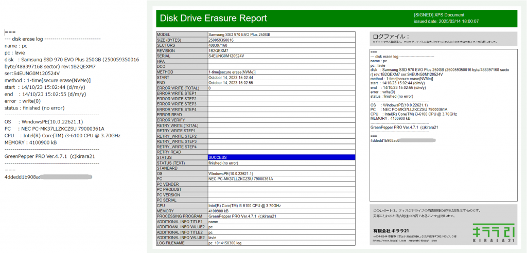 さらに、ログファイルから、一括して下記のような、"Disk Drive Erasure Report"(ディスクドライブ消去レポート)を、作成できます。このレポートは署名付きのXPSファイルで、こちらも改ざんチェックが可能です。